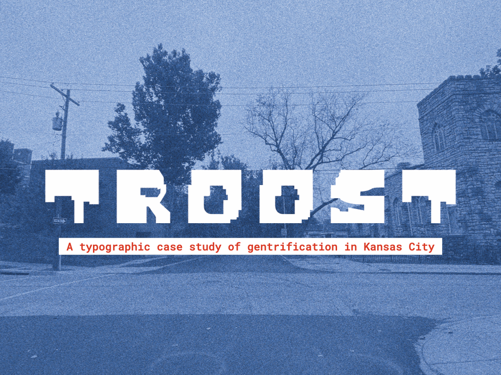 With a direct reference to redlining in Kansas City, Troost is site-specific and visually tied to district lines. The typeface also has elements of ornate structure, a nod to historic, pre-gentrified architecture. Troost is meant for display, like the decorative fonts used on storefronts by small businesses. It is a type that embraces historic specialness in the face of the threat of gentrification.